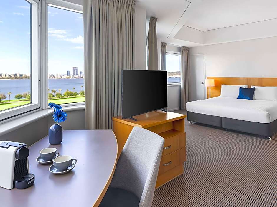 The spacious well-designed Junior Suite features views of the Swan River, a king-size bed, living area, a separate bathroom with a spa bath, and a walk-in wardrobe. Relax after a long day exploring the city in a Jacuzzi bath with exclusive bathroom amenities. The Junior Suite River View is the perfect nest to unwind and recharge.